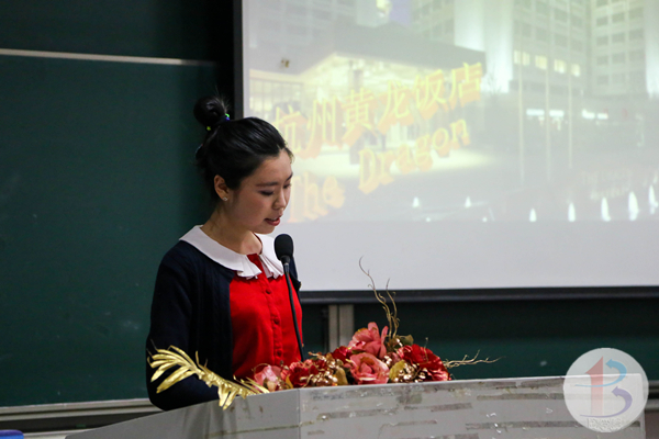 在观看完一段学生分享此次实习经验的视频后,10级学生--谢永柯、熊玉杰、方璐婕、施平平、罗贤城同学分别作了此次实习工作经验汇报,向大家讲述了他们在不同实习岗位上的酸甜苦辣以及在实习中获得的一些经验教训。在浙江省中国国际旅行社实习的谢永柯同学向大家分享了她在实习中发生的一些趣事,同时她也以自身经历为例向大家强调了工作需谨慎的重要性。在杭州黄龙饭店实习的熊玉杰同学用形象的实习时间轴向我们阐述了实习的大致工作,并同我们分享了她在实习中接待中国前外交部部长李肇星先生的故事。最后她告诫学弟学妹们在今后实习过程中,一定要调整好心态,摆正心态去工作。此外她还强调了外语能力的重要性,特别是外语口语能力和业务能力。之后,方璐婕、施平平同学也各自分享其在酒店实习中的经验,罗贤城同学更用风趣幽默的话语向我们讲述了在会展公司实习的心得体会。